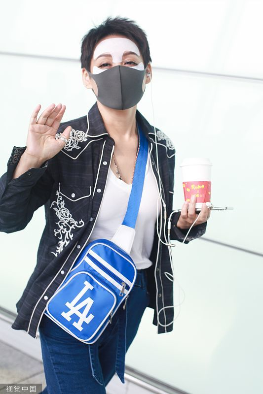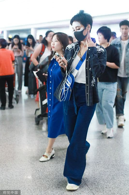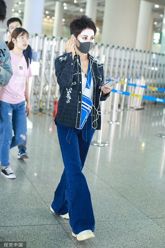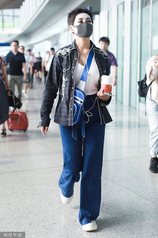 2019年6月19日,北京,寧靜現(xiàn)身機(jī)場。她穿敷面膜亮相短發(fā)干練個(gè)性灑脫,戴口罩對鏡揮手大方任拍。