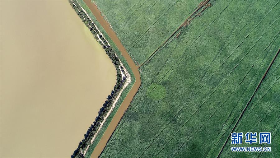 這是天津市寧河區(qū)七里海濕地內(nèi)蘆葦和水面形成的圖案(6月22日無(wú)人機(jī)拍攝)。新華社記者 岳月偉 攝