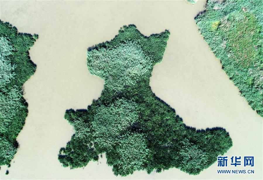 這是天津市寧河區(qū)七里海濕地內(nèi)蘆葦和水面形成的圖案(6月22日無(wú)人機(jī)拍攝)。