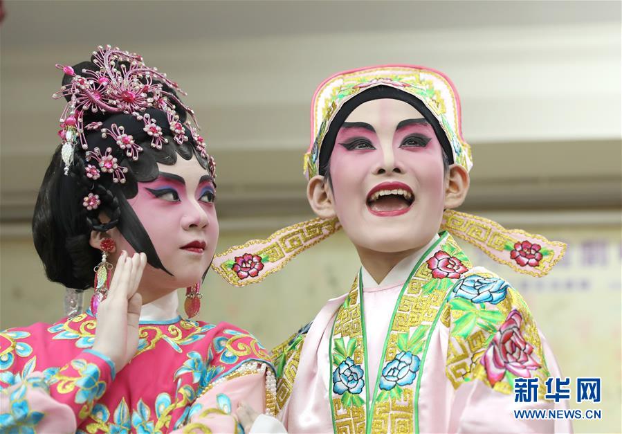 陸瑞徽(左)和利文喆在表演折子戲《艷曲醉周郎》(6月8日攝)。 聲輝粵劇推廣協(xié)會成立于2003年,是香港重要粵劇藝術(shù)團(tuán)體之一,致力于向青少年推廣粵劇。協(xié)會目前有兩個初班,3個中班,一個青少年班?;泟∮址Q“廣東大戲”,表演技藝包括“唱做念打”,即唱功、身段、臺詞、武打,主要流行于廣東、廣西和香港、澳門等地區(qū)。2009年,粵劇被列入聯(lián)合國教科文組織人類非物質(zhì)文化遺產(chǎn)代表作名錄,今年正逢十周年。 新華社記者 吳曉初 攝