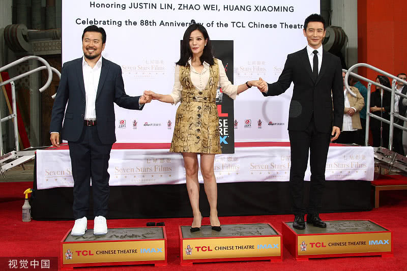 趙薇和黃曉明在好萊塢TCL中國大劇院門前按下象征世界電影人無上榮譽(yù)的手印,在該地留印的華人明星只有三個(gè),分別是成龍、吳宇森和馮小剛。