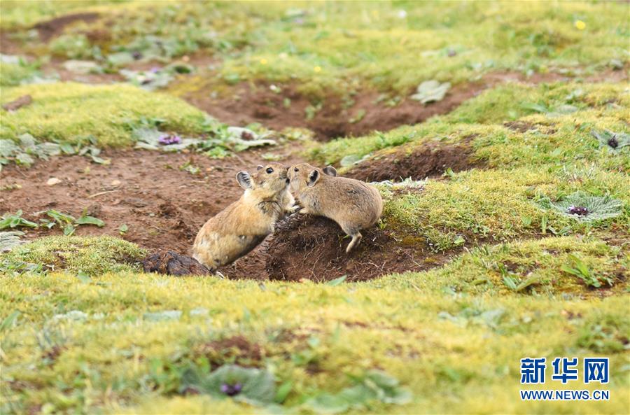 7月6日,兩只高原鼠兔在西藏思金拉錯(cuò)湖邊嬉戲。  新華社記者 周錦帥 攝