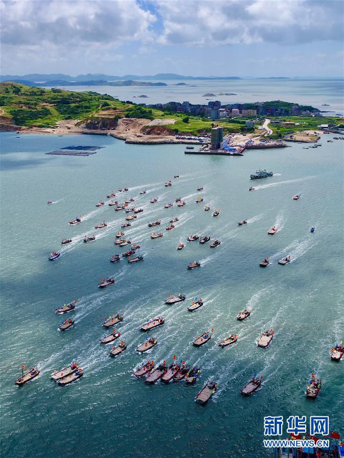 8月3日,在首屆福清開漁節(jié)上,漁船駛向大海(無人機拍攝)。新華社記者姜克紅攝