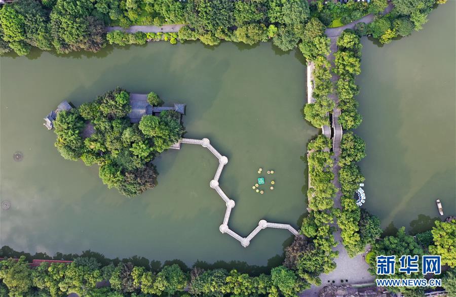 桂林市榕湖上的橋梁(7月1日無人機(jī)拍攝)。 夏日時(shí)節(jié),廣西桂林市區(qū)內(nèi)的榕湖、杉湖、桂湖、木龍湖等地綠樹成蔭、景色迷人。 新華社記者陸波岸攝