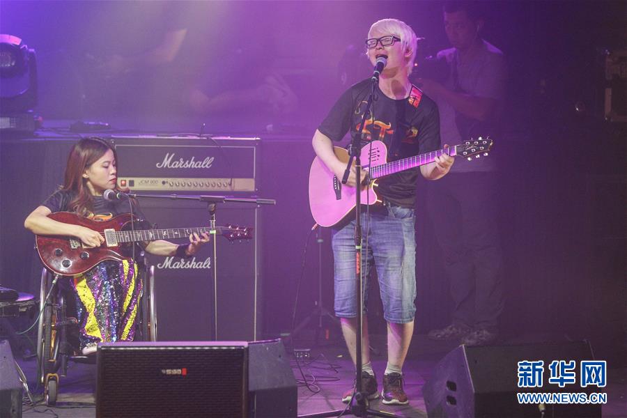 8月14日,8772樂隊成員謝航程(右)和程利婷在演唱會上表演。新華社記者張玉薇攝