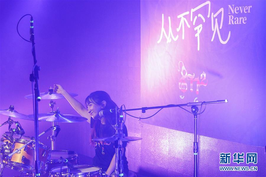8月14日,8772樂隊發(fā)起人、隊長王奕鷗(中)和樂隊成員崔瑩(左)、程利婷在演唱會上表演。新華社記者張玉薇攝
