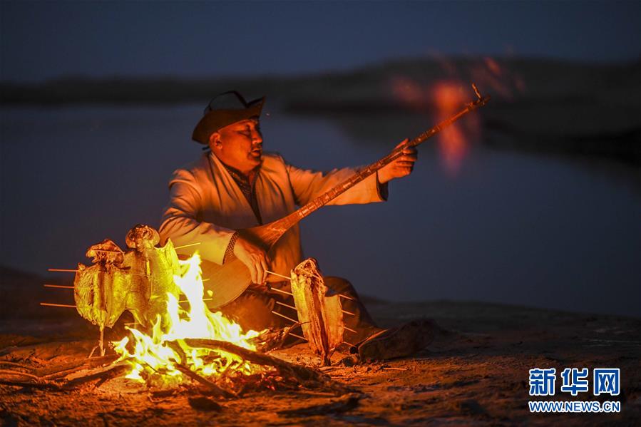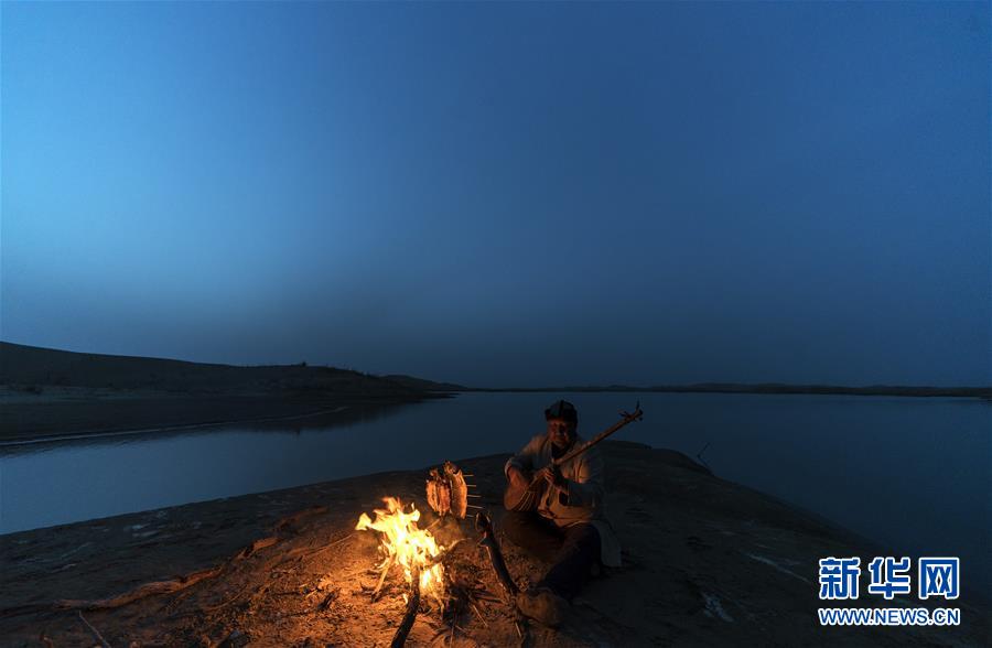 在羅布人村寨,阿木東·艾不東在沙漠里的一處海子旁彈奏樂(lè)器,等待烤魚烤熟(4月11日攝)。新華社記者 盧燁 攝