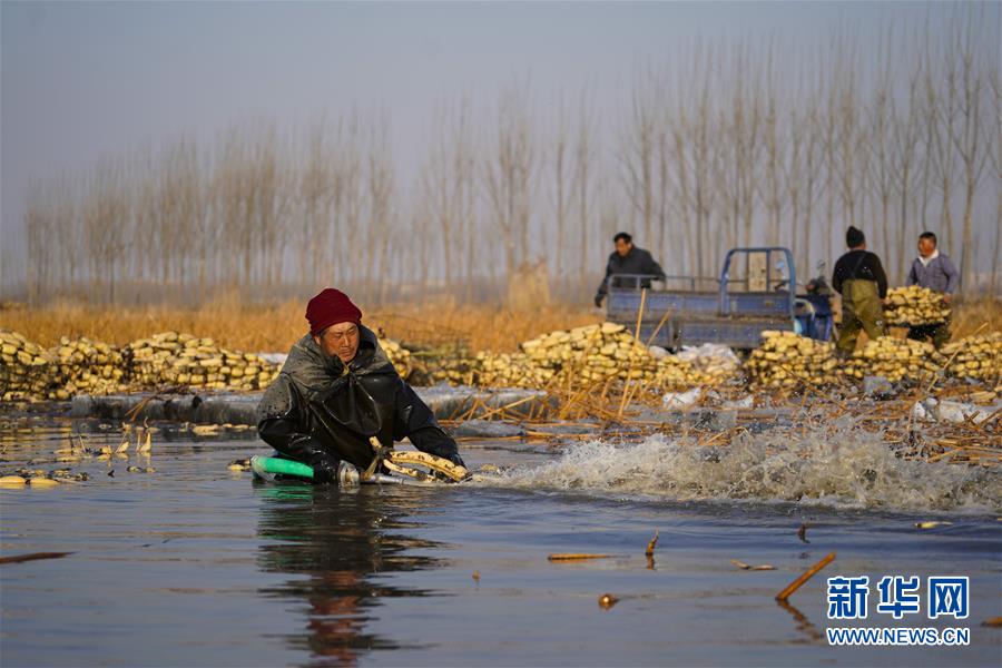 寒冬時(shí)節(jié),白洋淀里依然活躍著不少挖藕人,他們身穿橡膠工作服,在冰冷的水中辛勤工作。