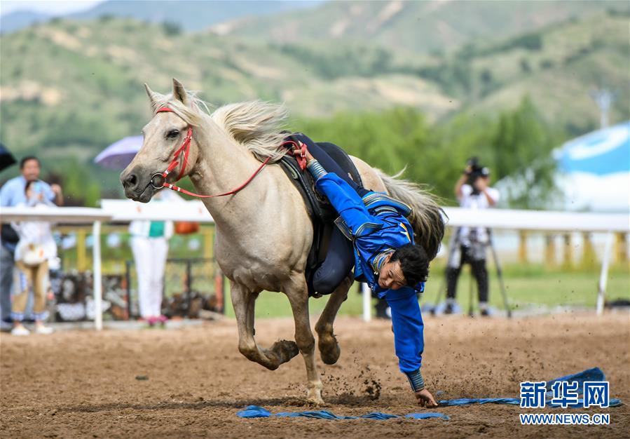 8月20日,騎手在“蒙古馬”傳統(tǒng)技巧表演中展示騎馬拾哈達(dá)。 新華社記者 彭源 攝