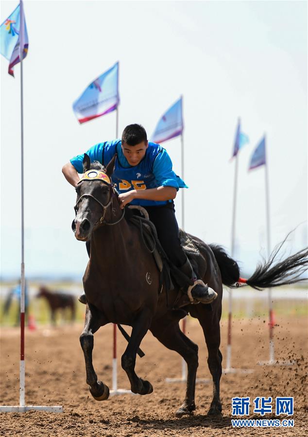 8月20日,騎手在“蒙古馬”傳統(tǒng)技巧表演中展示騎馬穿樁。 新華社記者 彭源 攝