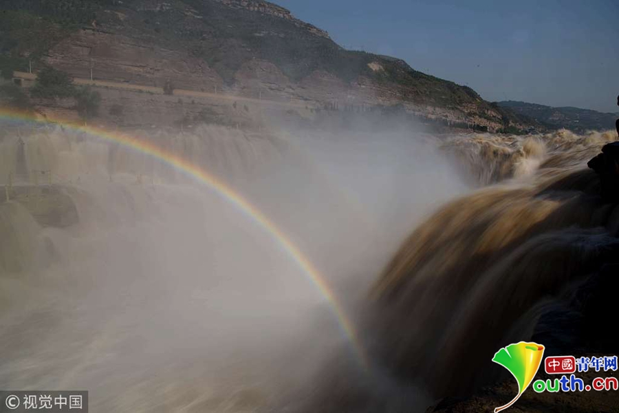 入秋以來,山西吉縣黃河壺口瀑布景區(qū)天氣晴好,黃河干流水量豐沛,壺口瀑布飛濺的浪花和水霧在陽光的照射下,形成“彩虹門”景觀,吸引了眾多游客。