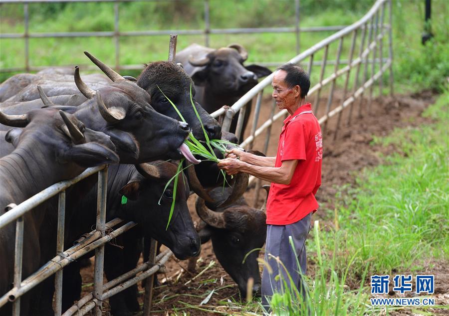 在廣西融安縣大良鎮(zhèn)古蘭村古蘭屯養(yǎng)?;?,68歲的韋肇翠在喂牛(8月18日攝)。韋肇翠是養(yǎng)?;氐娘曫B(yǎng)員,每個月有2800元的工資。 新華社記者 黃孝邦 攝