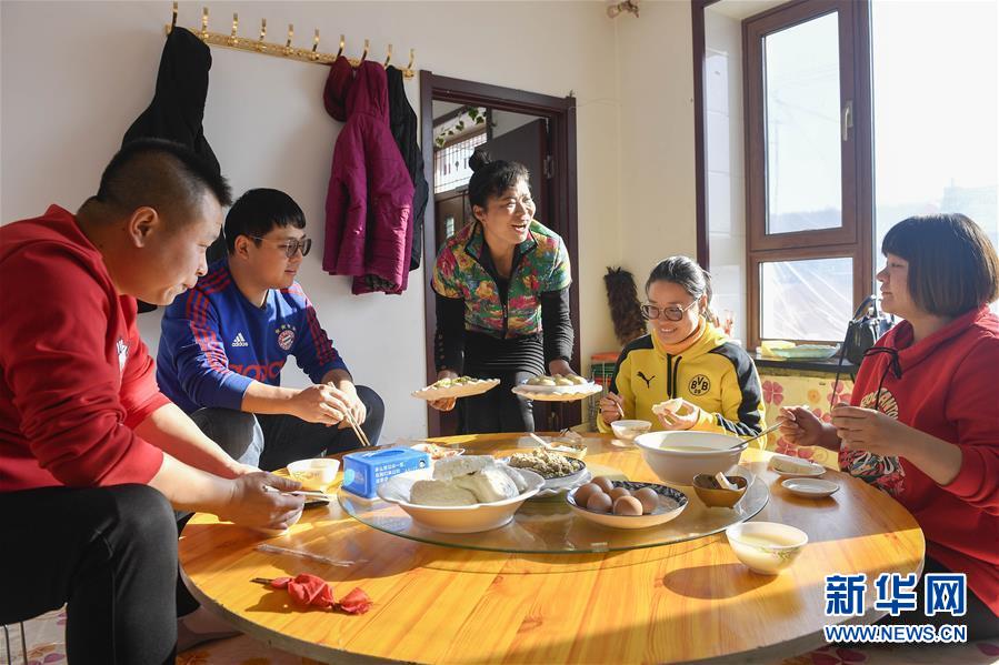 在舒蘭市二合屯,吳慶榮(右三)在自家的農(nóng)家樂內(nèi)為游客上菜(1月26日攝)。新華社記者許暢攝