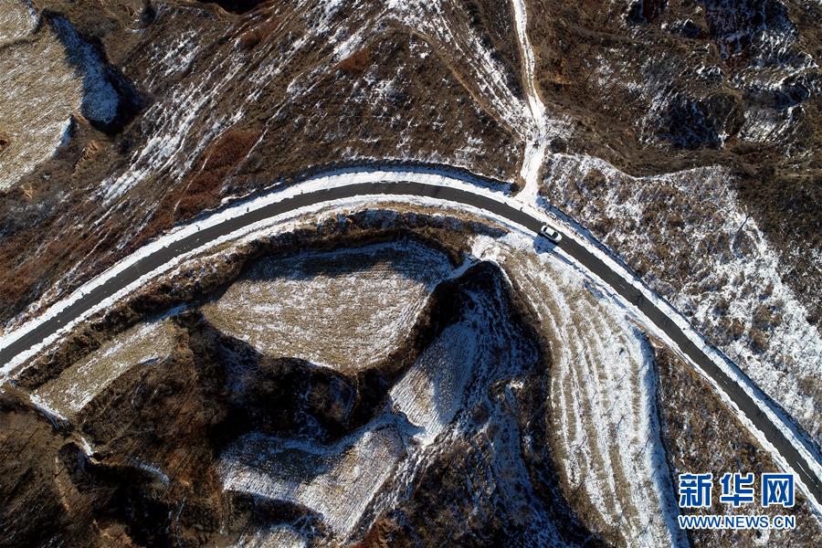 車輛行駛在王莊溝村通往大有鄉(xiāng)的道路上(2月16日無人機(jī)拍攝)。 新華社記者 詹彥 攝