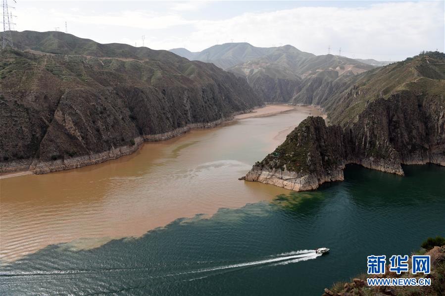 在甘肅省永靖縣劉家峽水庫,一艘快艇在洮河和黃河的匯合水域行駛(6月2日攝)。