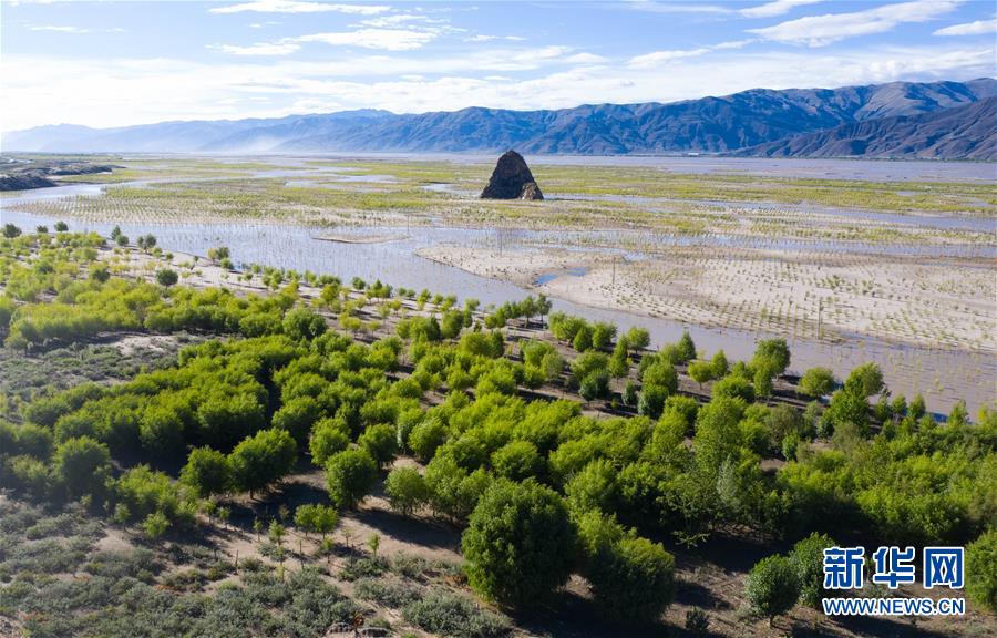 西藏雅魯藏布江兩岸栽植的樹木(7月16日無人機拍攝)。新華社記者 普布扎西 攝