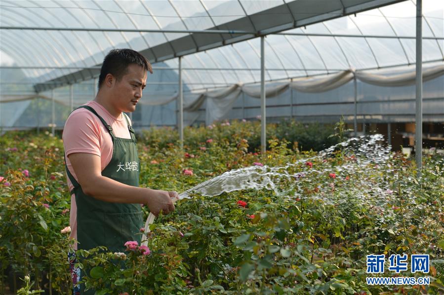 在沭陽縣新河鎮(zhèn)新槐村,張炎在花卉大棚內給月季花澆水(8月24日攝)。  新華社記者 任鵬飛 攝