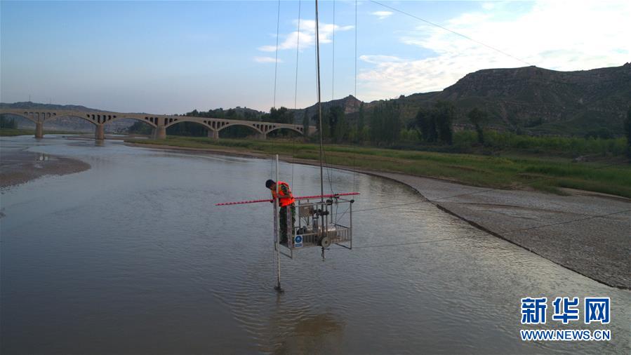 溫家川水文站站長鄭威在窟野河取沙(9月7日攝)。新華社記者劉詩平攝