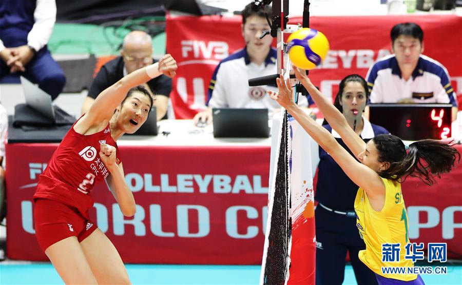 9月22日,中國隊球員朱婷(左)在比賽中扣球。當日,在日本札幌舉行的2019年女排世界杯賽第二階段A組循環(huán)賽比賽中,中國隊以3比2戰(zhàn)勝巴西隊。新華社記者杜瀟逸攝