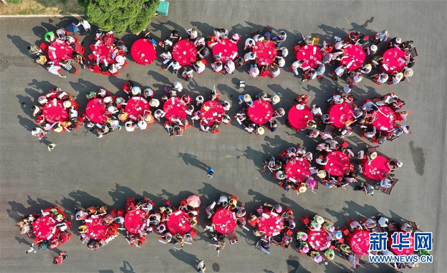 10月1日,在江西省南昌市南昌縣銀三角敷林村,當(dāng)?shù)卮迕衽e行“同吃國慶面 共迎國慶節(jié)”活動(無人機(jī)拍攝)。當(dāng)日是國慶節(jié),全國各地的人們用各種方式歡度節(jié)日。新華社記者 彭昭之 攝