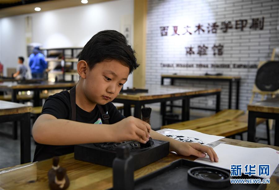 10月2日,游客在寧夏銀川市西夏陵景區(qū)體驗西夏文木活字印刷。  新華社記者 馮開華 攝