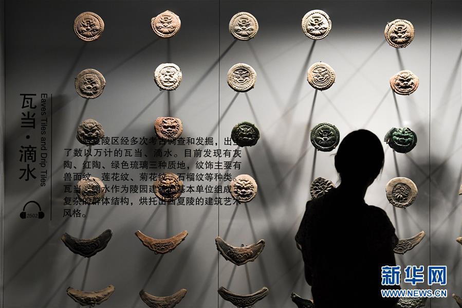 10月2日,游客在寧夏銀川市西夏陵景區(qū)的西夏博物館觀看展出的瓦當(dāng)、滴水。 新華社記者 馮開(kāi)華 攝