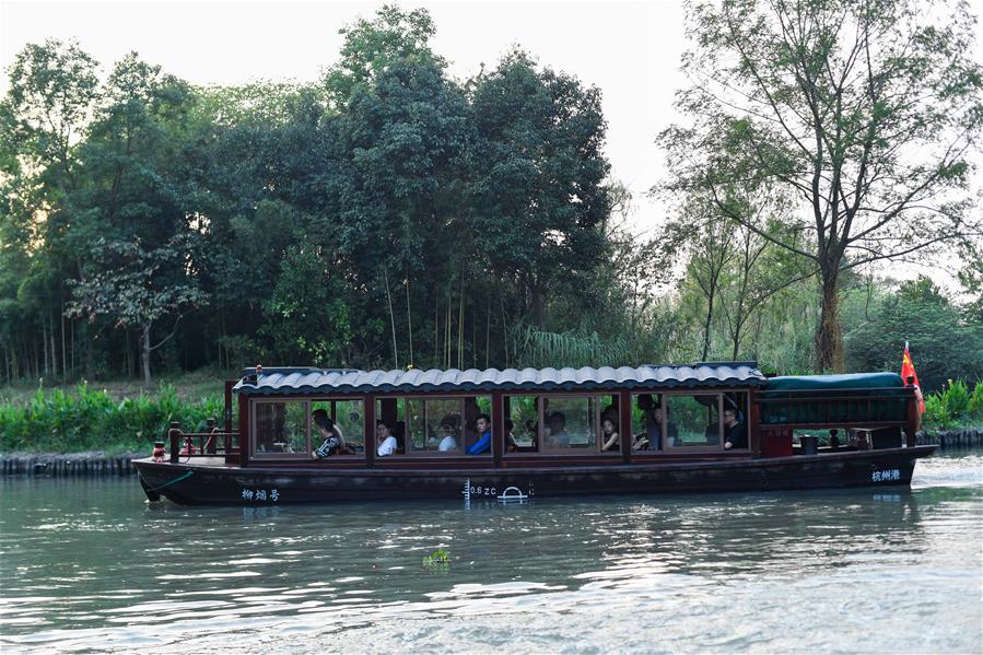 10月3日,游客在西溪國(guó)家濕地公園乘船游覽。 當(dāng)日是國(guó)慶假期第三天,大批游客來(lái)到位于杭州的西溪國(guó)家濕地公園游玩,在江南詩(shī)意的環(huán)境中休閑度假。 新華社記者 黃宗治 攝