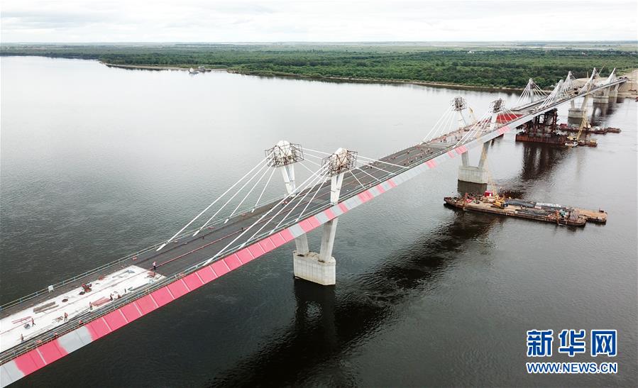 正在進(jìn)行橋面鋪裝施工作業(yè)的黑河到布拉戈維申斯克黑龍江(阿穆爾河)大橋(8月19日無人機(jī)拍攝)。新華社記者 王建威 攝