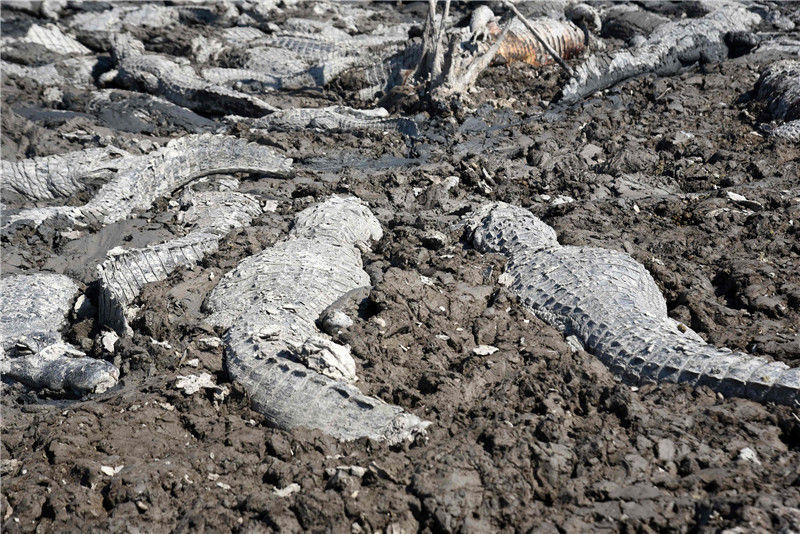 當(dāng)?shù)貢r(shí)間2016年6月24日,巴拉圭General Diaz,巴拉圭與阿根廷邊境遭遇嚴(yán)重干旱,皮科馬約河河水枯竭,凱門鱷在水塘內(nèi)。