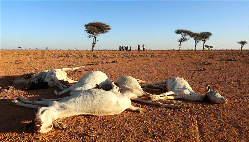 當(dāng)?shù)貢r(shí)間2016年12月15日,索馬里邦特蘭,干旱的土地上散布著羊的尸體。當(dāng)?shù)卦庥龈珊堤鞖?,牲畜受到危害?br/>