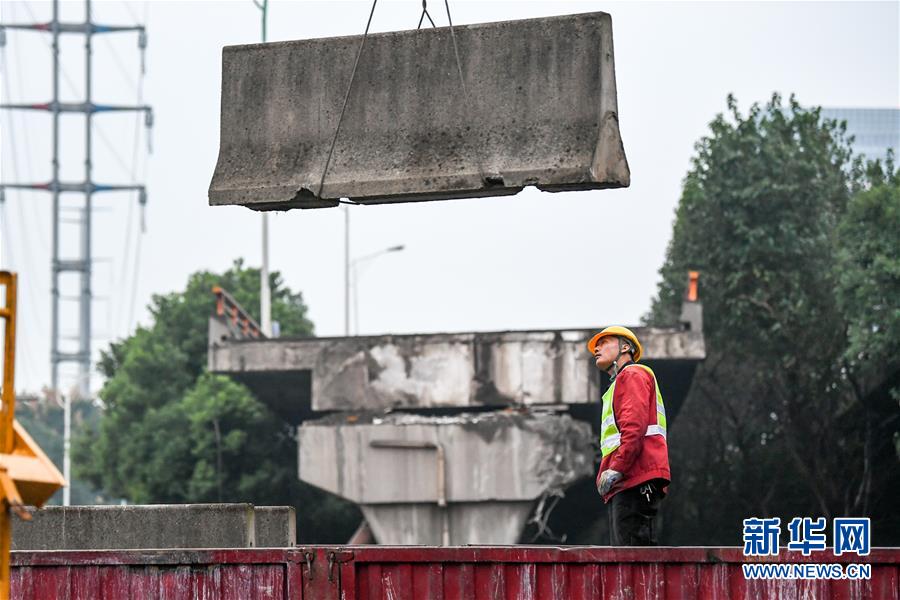 10月12日,錫港路恢復(fù)通車前,施工人員在進行路面清理工作。新華社記者 李博 攝