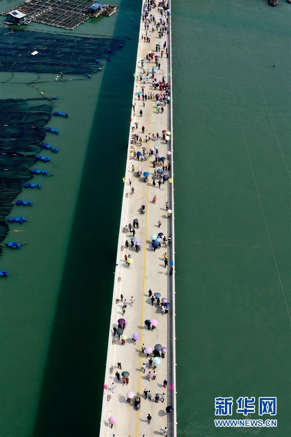 10月12日,福建省霞浦縣東安島海防大橋正式通車(chē),這是當(dāng)?shù)厝罕娮咴谛聵蛏希o(wú)人機(jī)拍攝)。新華社記者姜克紅攝