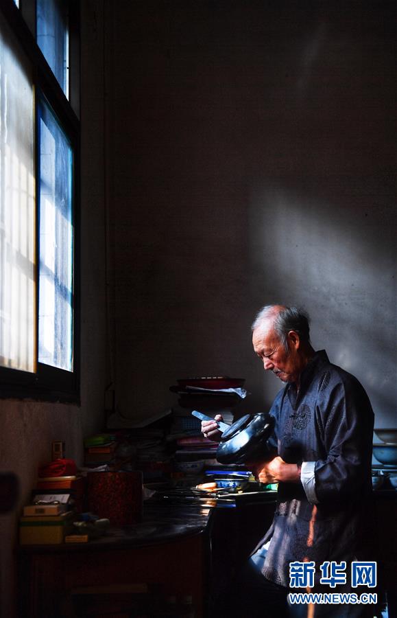 10月12日,丁國(guó)坤在家中為一件未成形的脫胎漆器進(jìn)行“上漆”工序。