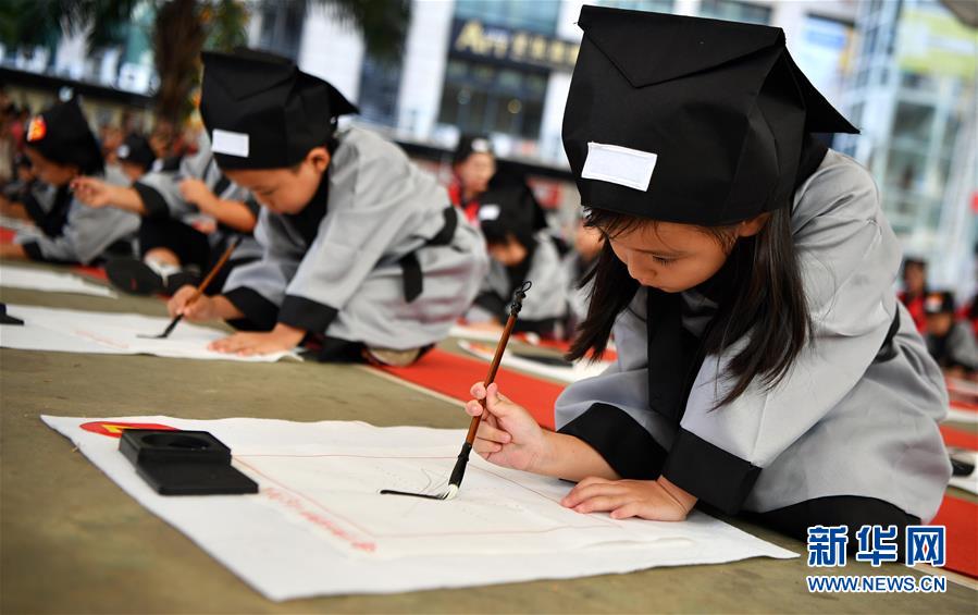 10月13日,參加儀式的小朋友在蘸墨寫字。當(dāng)日,??诤嬌賰核囆g(shù)中心為500名小朋友舉行“開筆禮”,通過“點(diǎn)朱砂,啟智慧”“習(xí)書法,描人字”等儀式讓孩子們體驗(yàn)中國傳統(tǒng)文化。新華社記者郭程攝
