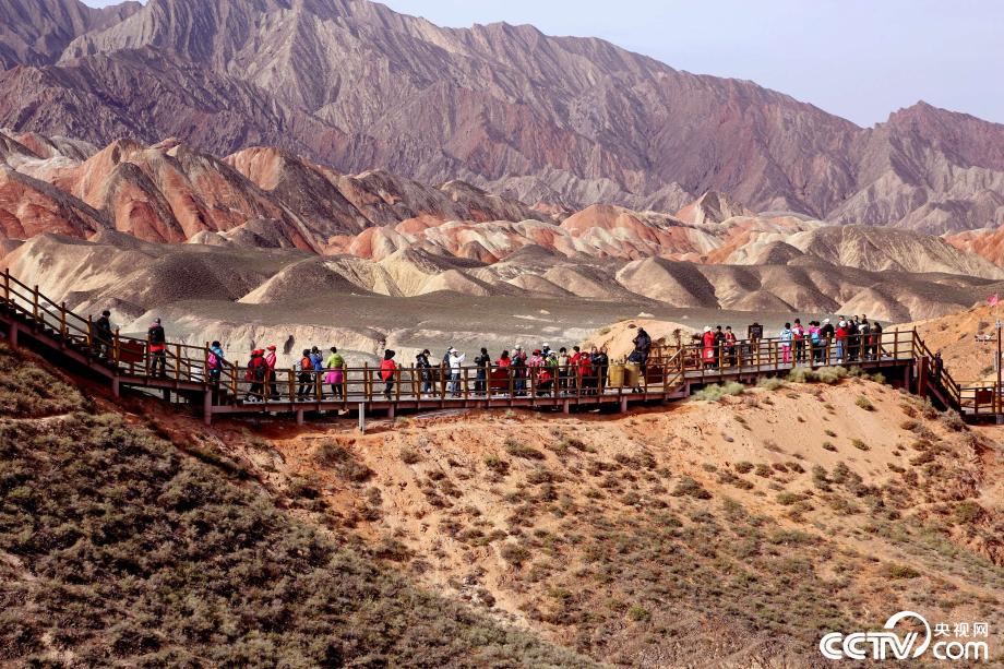 央視網(wǎng)消息:2019年10月15日,金秋時節(jié),位于甘肅省張掖市臨澤縣的七彩丹霞景區(qū)進(jìn)入旅游旺季,吸引眾多游人紛至沓來。張掖七彩丹霞景區(qū),分布面積約50公里,是中國北方干旱地區(qū)發(fā)育最典型的丹霞地貌。在方圓數(shù)十平方公里的范圍內(nèi),隨處可見有紅、黃、橙、綠、白等多種鮮艷的色塊或線條,把一座座山峰,一條條溝壑,裝點(diǎn)成一幅幅絢麗多姿、燦爛奪目的畫圖。圖片來源:視覺中國