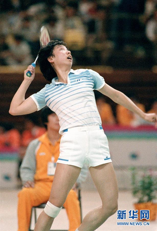 圖為韓愛(ài)萍在福州舉行的1986年“登喜路”中國(guó)羽毛球公開(kāi)賽女子單打決賽中擊球(1986年6月1日攝),她最終奪得女單冠軍。新華社記者官天一攝