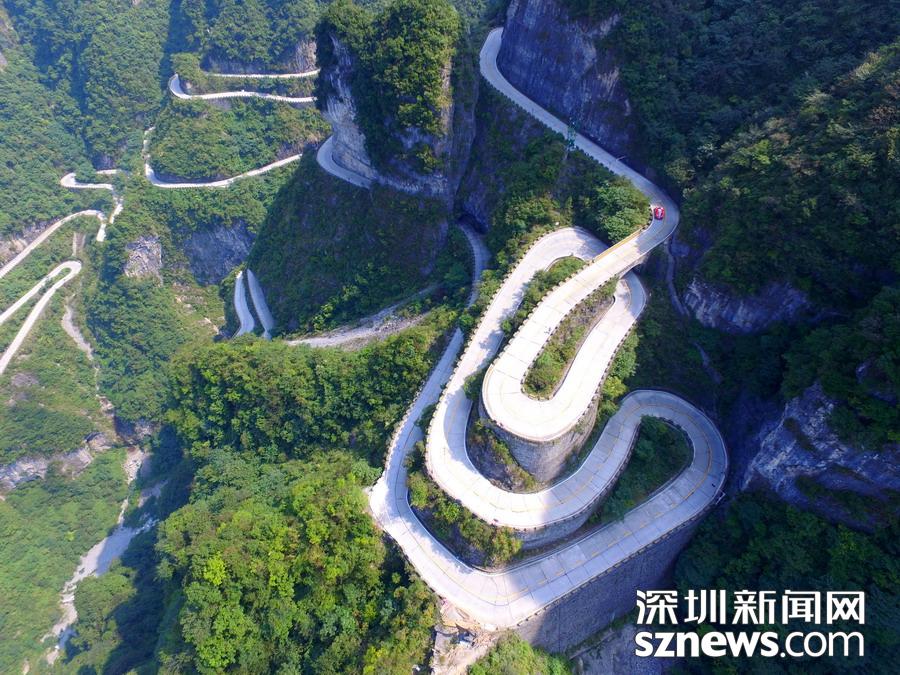 天門(mén)山盤(pán)山公路位于湖南省張家界市境內(nèi)的國(guó)家森林公園天門(mén)山上,盤(pán)山公路全長(zhǎng)10.77公里,海拔從200米急劇提升到1300米,大道兩側(cè)絕壁千仞,空谷幽深,共計(jì)99個(gè)彎,180度急彎此消彼長(zhǎng),似玉帶環(huán)繞,航拍鏡頭下蜿蜒曲折的道路彎彎緊連,層層迭起,宛如迷宮般的“納斯卡線條”,被譽(yù)為“天下第一公路奇觀”,同時(shí)它也是世界上最危險(xiǎn)的十大公路之一。