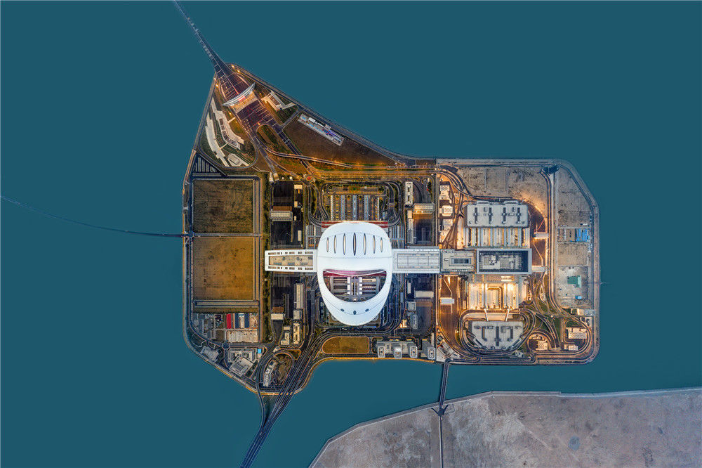 2019年1月6日,廣東珠海,航拍港珠澳大橋人工島夜景美如畫。ainyone/視覺中國