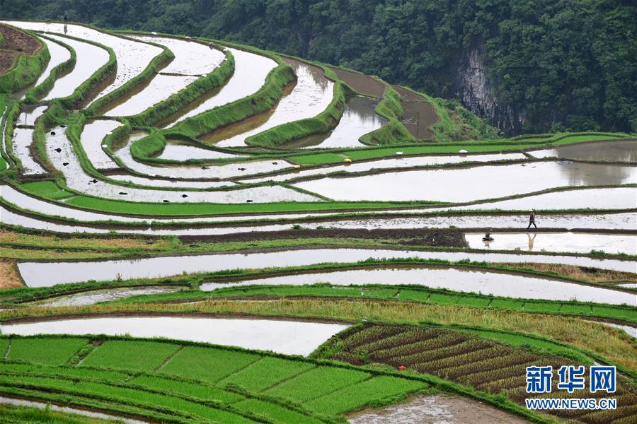 5月18日,農(nóng)民從貴州省丹寨縣龍泉鎮(zhèn)高要梯田里走過。初夏時(shí)節(jié),位于貴州省丹寨縣龍泉鎮(zhèn)的高要梯田景色優(yōu)美。新華社記者楊文斌攝
