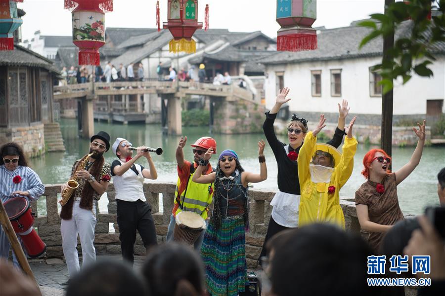 10月26日,一個(gè)劇團(tuán)在烏鎮(zhèn)街頭表演。 新華社記者翁忻旸攝