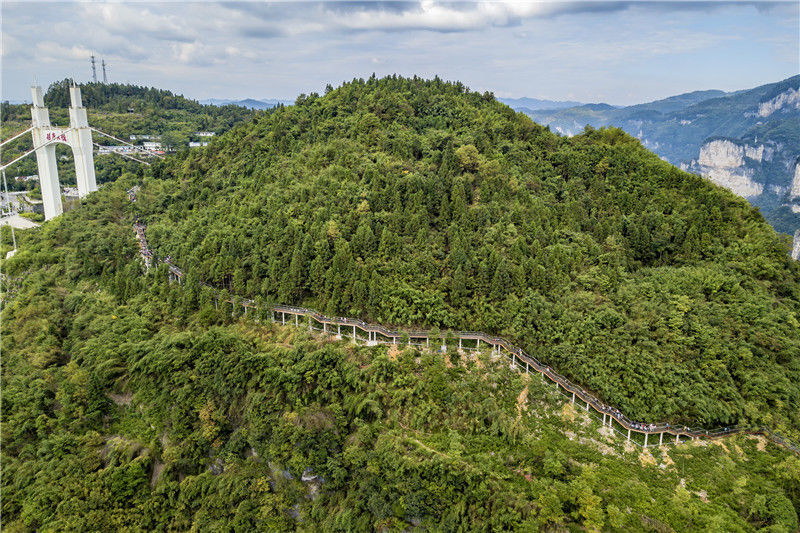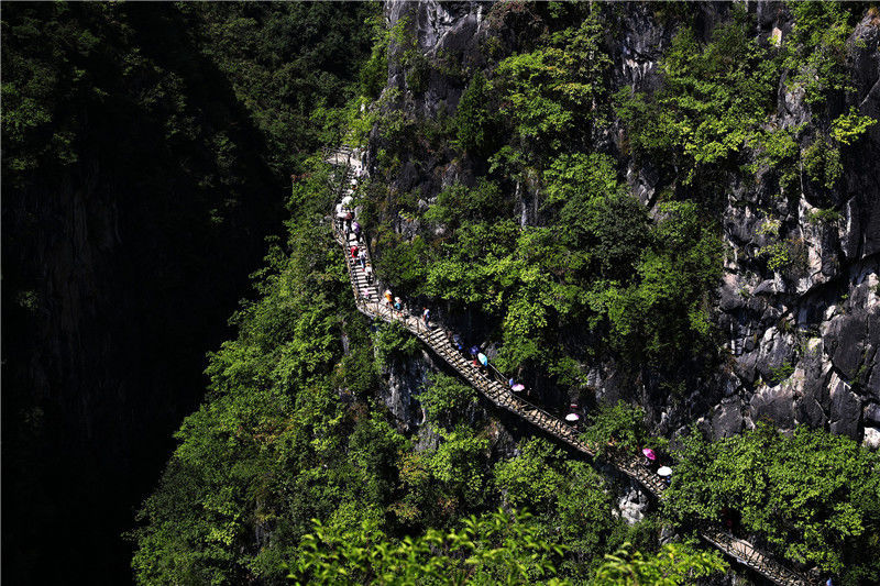 2019年9月13日,游客在重慶市黔江區(qū)城市峽谷景區(qū)芭拉胡的懸崖棧道上游玩。當(dāng)天是中秋節(jié)假的第一天。楊敏/視覺(jué)中國(guó)編輯/陳進(jìn)