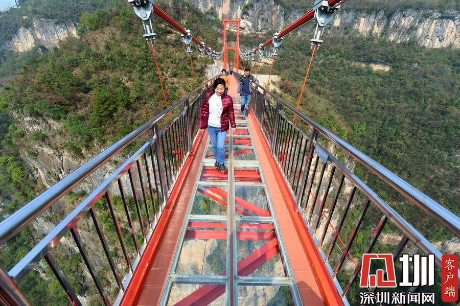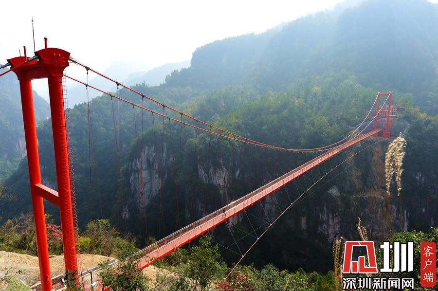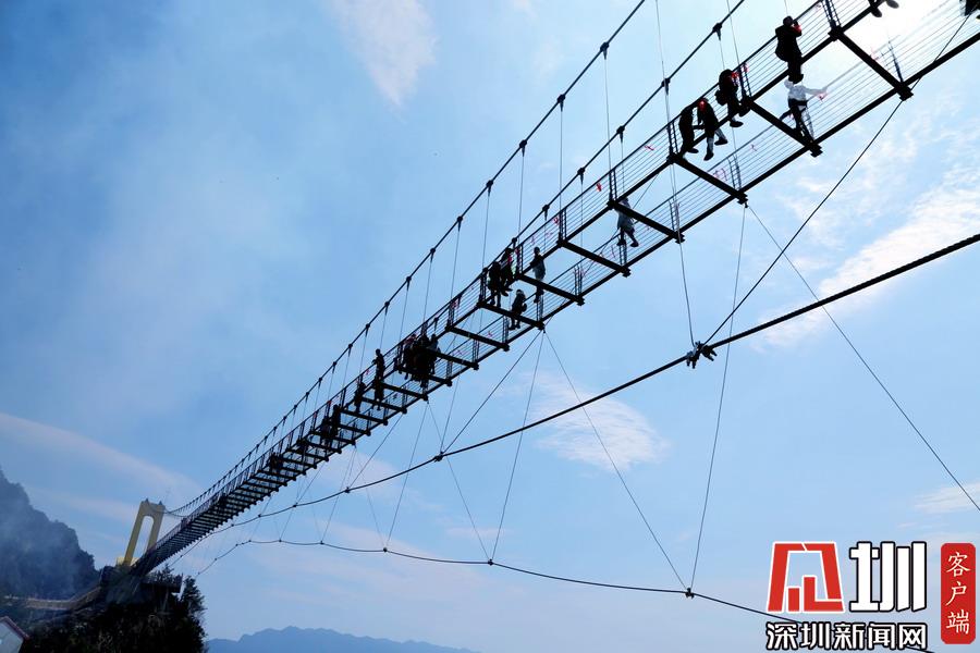 2017年11月5日,游客走在湖北省??悼h歇馬鎮(zhèn)九路寨景區(qū)戰(zhàn)口河人行懸索橋上觀光。