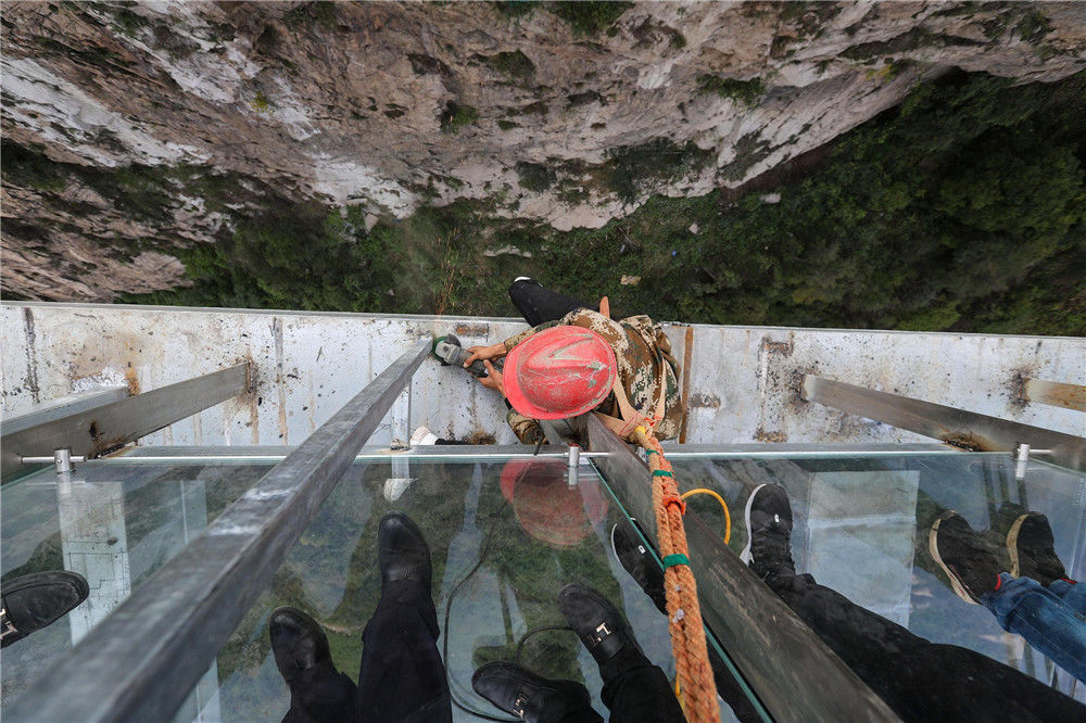 2019年9月20日,從落差198米懸崖上伸出周長(zhǎng)60米懸空的“高空玻璃懸廊”在河南南陽(yáng)七峰山落成,該玻璃懸廊名為“云頂之心”。圖為建筑工人進(jìn)行收尾工作。王中舉(河南分社)/中新社/視覺(jué)中國(guó)編輯/康娜
