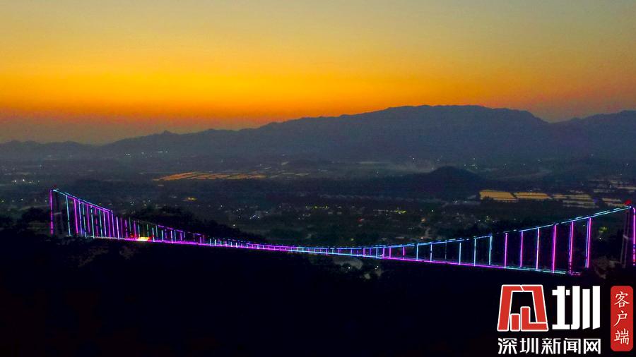 2018年10月7日,廣東佛山。網(wǎng)友紛紛稱佛山南丹山玻璃橋是廣東最美玻璃橋。漸漸地,金燦燦的陽光變?yōu)榱顺赛S色,開始變得柔和,嫵媚動(dòng)人,給美麗恬靜的群山抹上一層金光。太陽開始脫去華麗的金絲紗裙,換上了橘黃色的時(shí)尚。玻璃橋也穿上了端莊典雅的晚禮服,露出那像蒙娜麗莎一樣迷人的笑容。