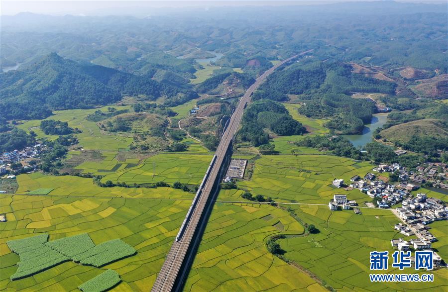 10月29日,列車從廣西賓陽(yáng)縣古辣鎮(zhèn)豐收的稻田間駛過(guò)(無(wú)人機(jī)拍攝)。新華社記者陸波岸攝