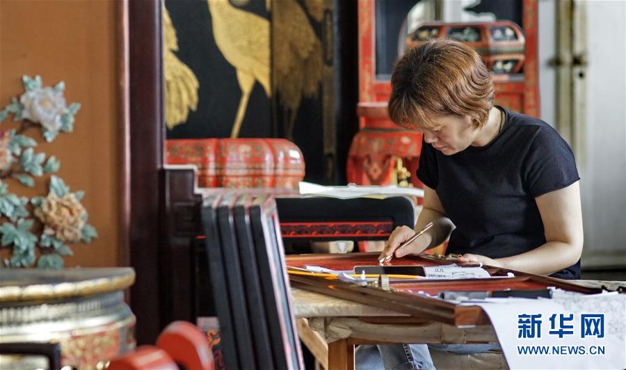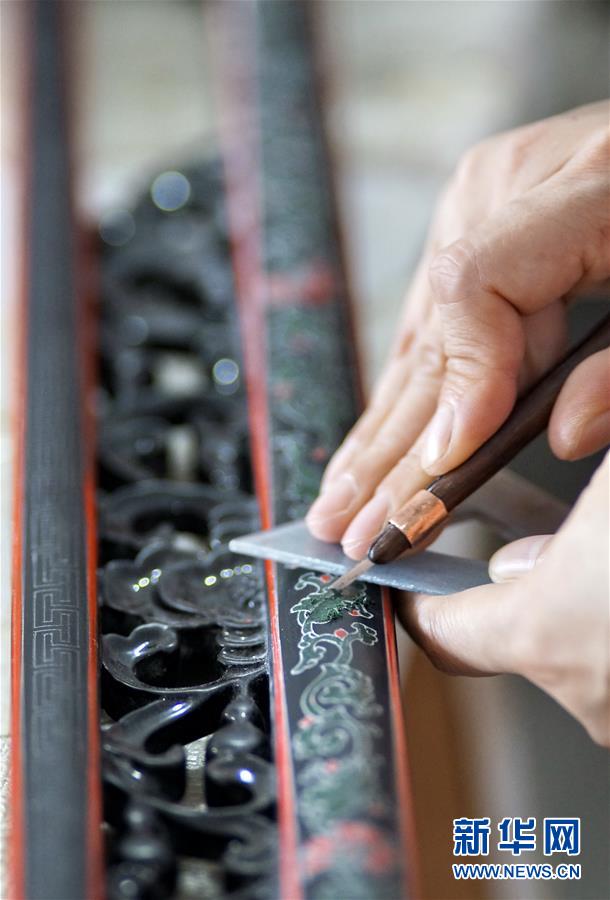 北京金漆鑲嵌有限責(zé)任公司工藝美術(shù)大師胡昕在創(chuàng)作漆畫屏風(fēng)(9月19日攝)。新華社記者李欣攝