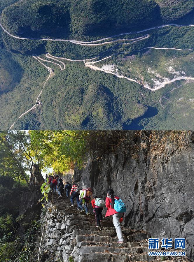 拼版照片:上圖為大化瑤族自治縣七百弄鄉(xiāng)弄良村弄丘屯剛剛修通的公路(右下段)和村道、鄉(xiāng)道連接(11月12日無人機拍攝);下圖為在尚未通路的弄良村弄丘屯,孩子們爬“天梯”回家(2016年12月9日攝)。新華社記者 黃孝邦 攝