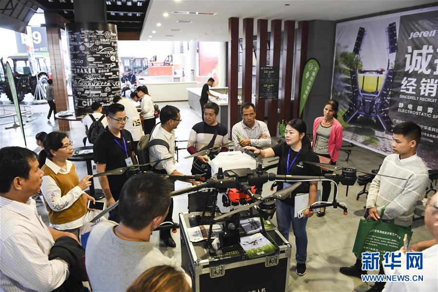 11月16日,參展商在展會(huì)現(xiàn)場(chǎng)給參觀者介紹植保無(wú)人機(jī)的使用方法。新華社記者曹祎銘攝