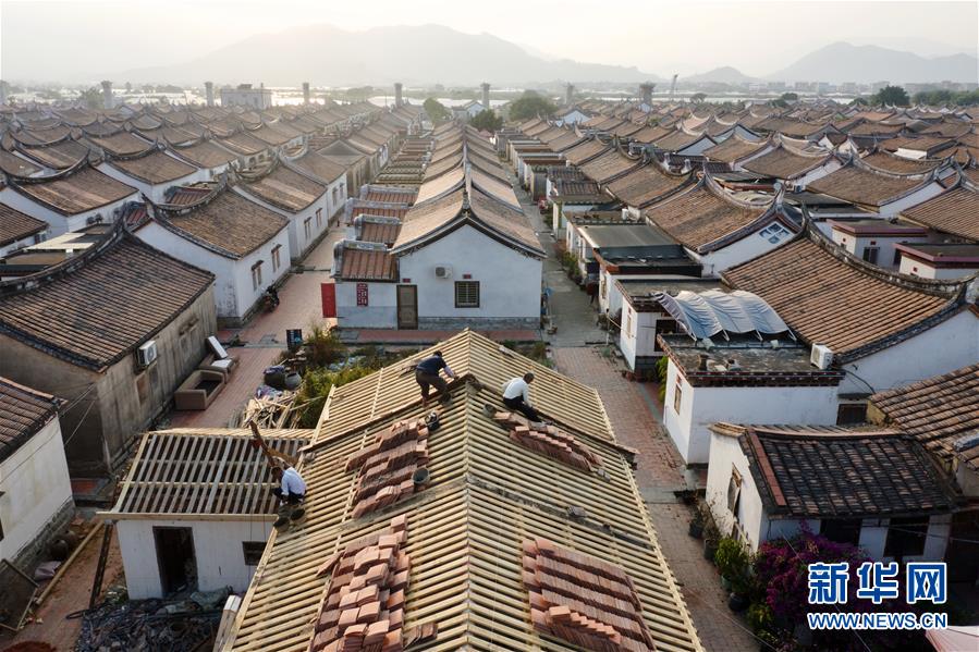11月14日,埭美村村民在修繕一座古民居(無人機(jī)拍攝)。新華社記者姜克紅攝