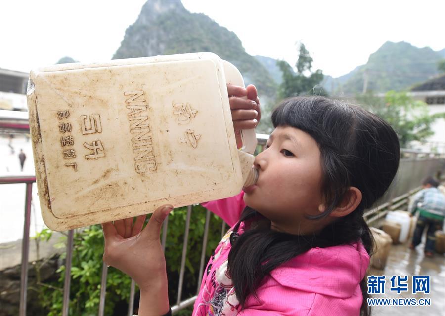 在廣西大化瑤族自治縣板升鄉(xiāng)八好小學(xué),一名學(xué)生喝水桶里的雨水(2014年11月24日攝)。八好小學(xué)有400多名學(xué)生,曾僅有一個不足100立方米的水柜,用于收集儲存樓頂?shù)挠晁?,學(xué)生需定期定量用水。遇到長時間不下雨,學(xué)校需要到鄉(xiāng)政府所在地運水。如今,學(xué)校修建了5個大水柜,并從兩公里外引泉水到校園,飲水難問題得到解決。新華社記者黃孝邦攝